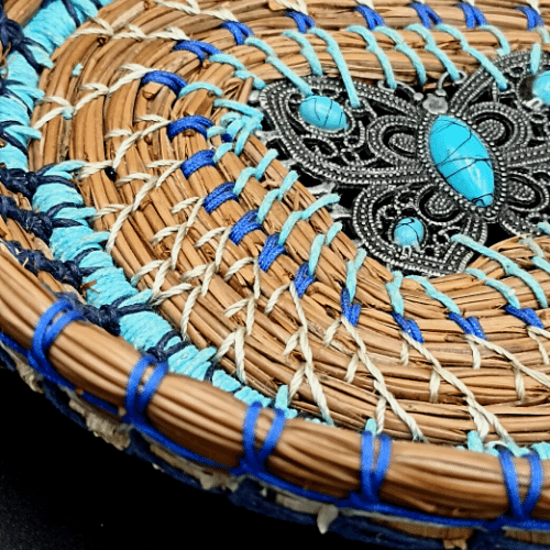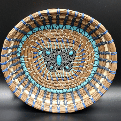 Coupelle en aiguilles de pin et feuilles d’iris. Le centre est un élément de ceinture vintage.